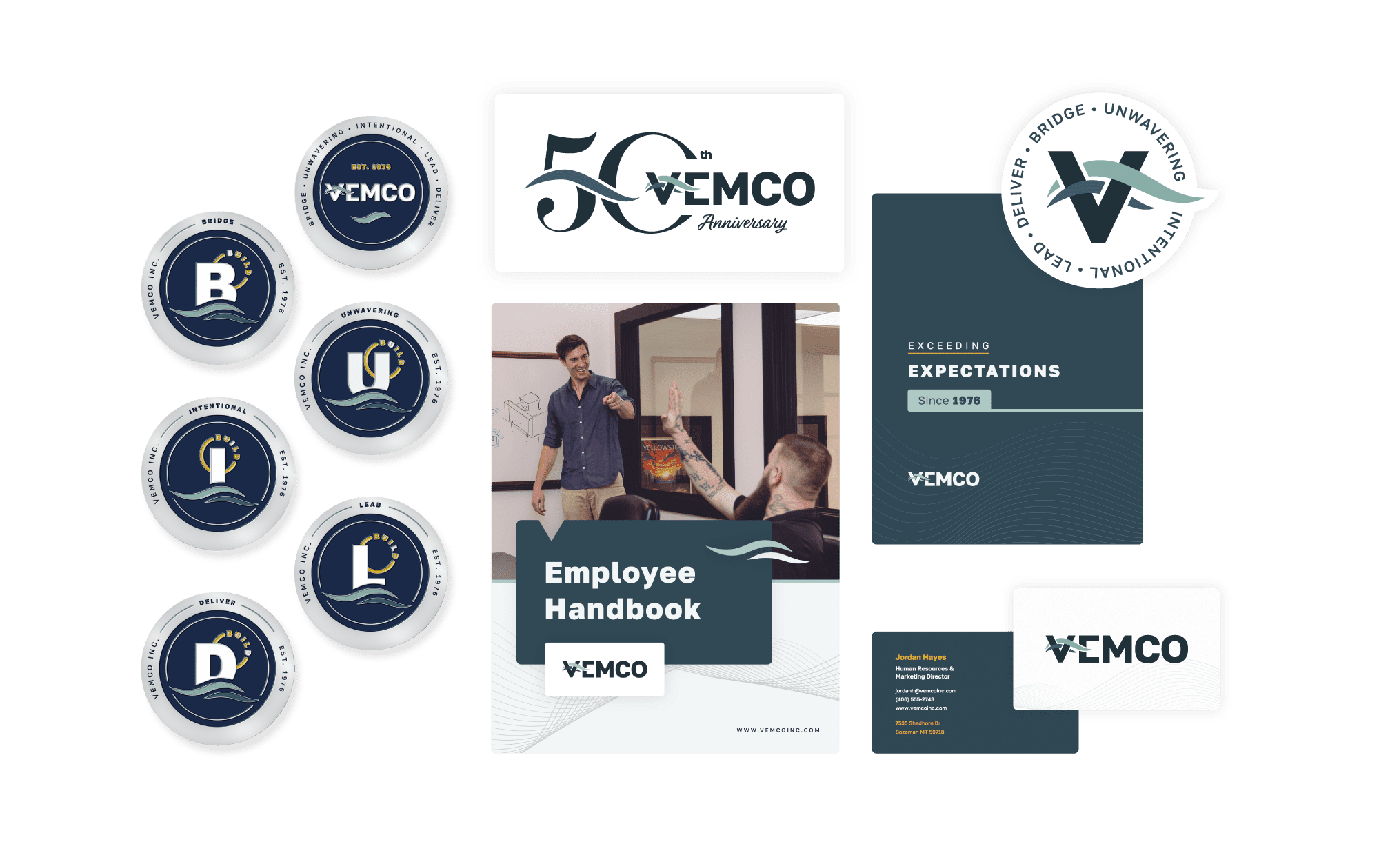 To ensure that consistency didn’t stop at the website, we built a complete brand collateral system, including email signature templates, letterhead, business cards, PowerPoint templates, truck decals, social media graphics, and commemorative coins. From boardrooms to job sites, Vemco now has a cohesive look everywhere they show up and ready-to-use collateral whenever they need it.